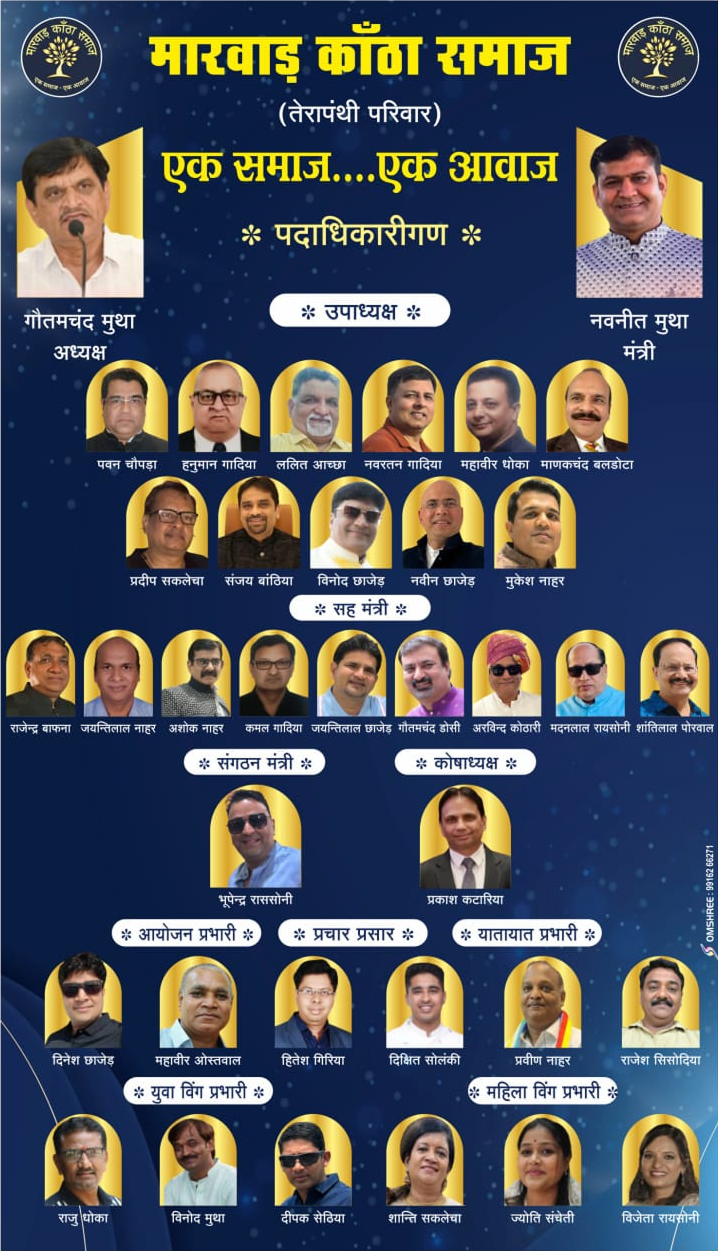 आचार्य श्री महाश्रमणजी के सुशिष्य डॉ मुनिश्री पुलकितकुमारजी ठाणा २ के सानिध्य में नव गठित मारवाड़ कांठा क्षेत्र के तेरापंथ समाज के संगठन मारवाड़ कांठा समाज का शपथ ग्रहण समारोह आयोजित हुआ। कांठा क्षेत्र के वरिष्ठ बावक पारसमलजी भंसाली ने नव नियुक्त संस्थापक अध्यक्ष के रूप में गौतमचंदजी मुधा को अध्यक्ष पद की शपथ दिलाई। अध्यक्ष गौतमबंदजी मुचा ने उपाध्यक्ष के रूप में पवनजी चौपड़ा, नवरतनजी गादिया, माणिकत्वंदजी बलरोटा, महावीरजी धोका, कलेवा, संजयजी बाडिया, प्रदीपनी नवीनजी खाजेड़, विनोदजी छाजेड़, मुकेशजी नाहर, ललितजी जाच्छा, हनुमानबंदजी गादिया तथा मंत्री नवनीतजी मया सहमंत्री